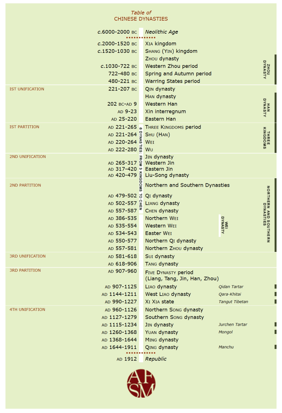 See a historical table of the Chinese Dynasties.